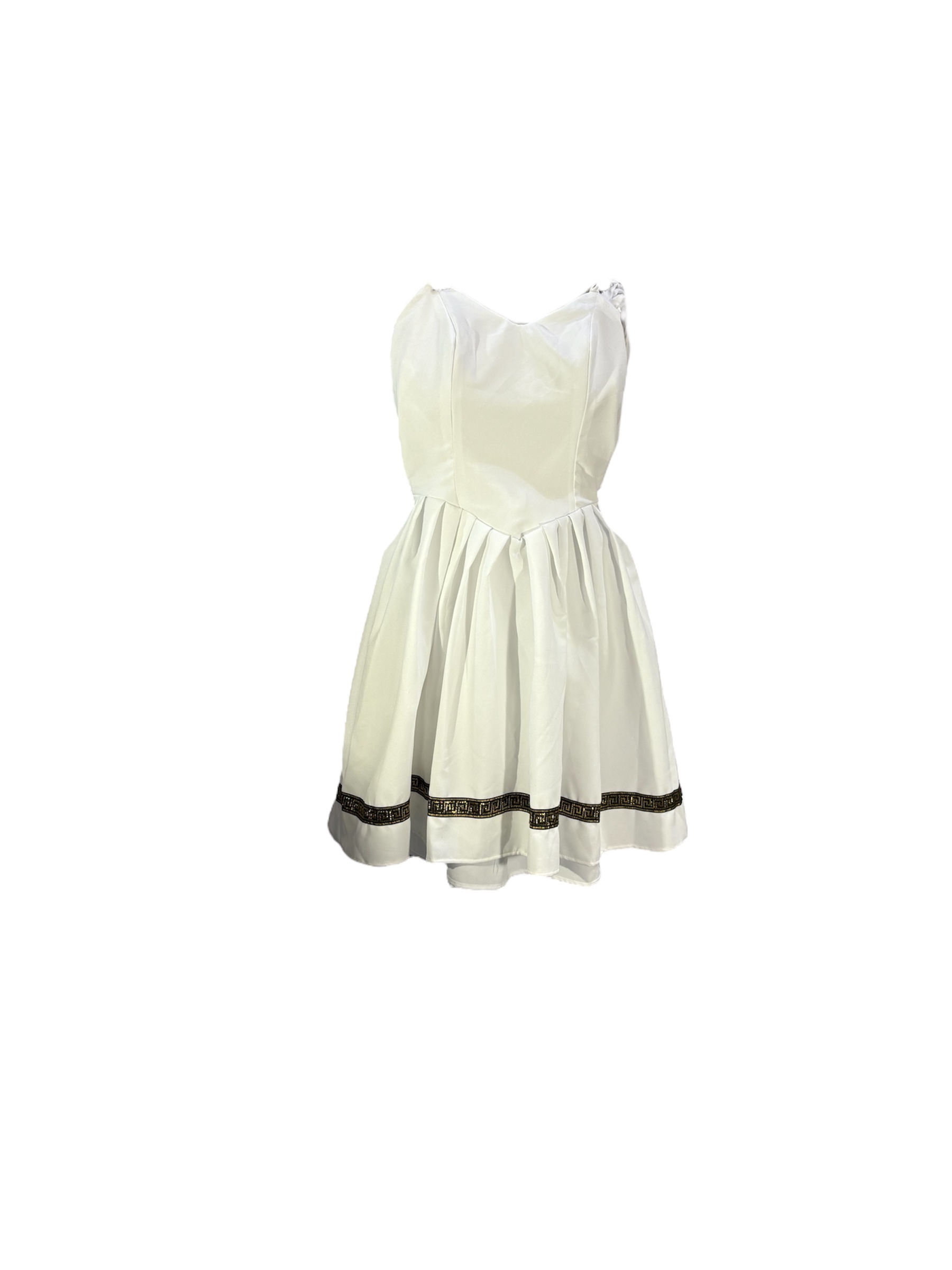 - Short strapless white dress with gold trim and drape attached to one shoulder