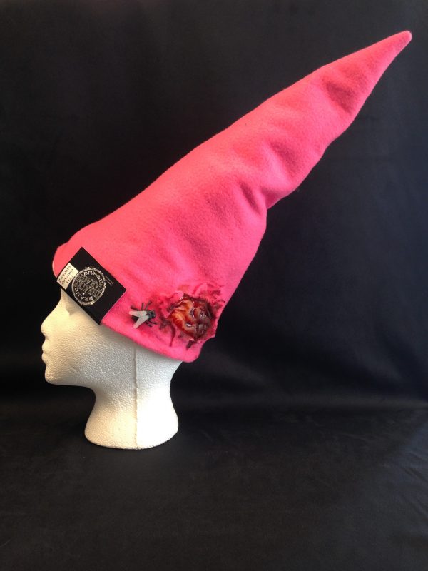 Our Zombie Gnome Hats are soft stuffed fleece hat with a latex brain coming out of the side. Approximately 18" tall.