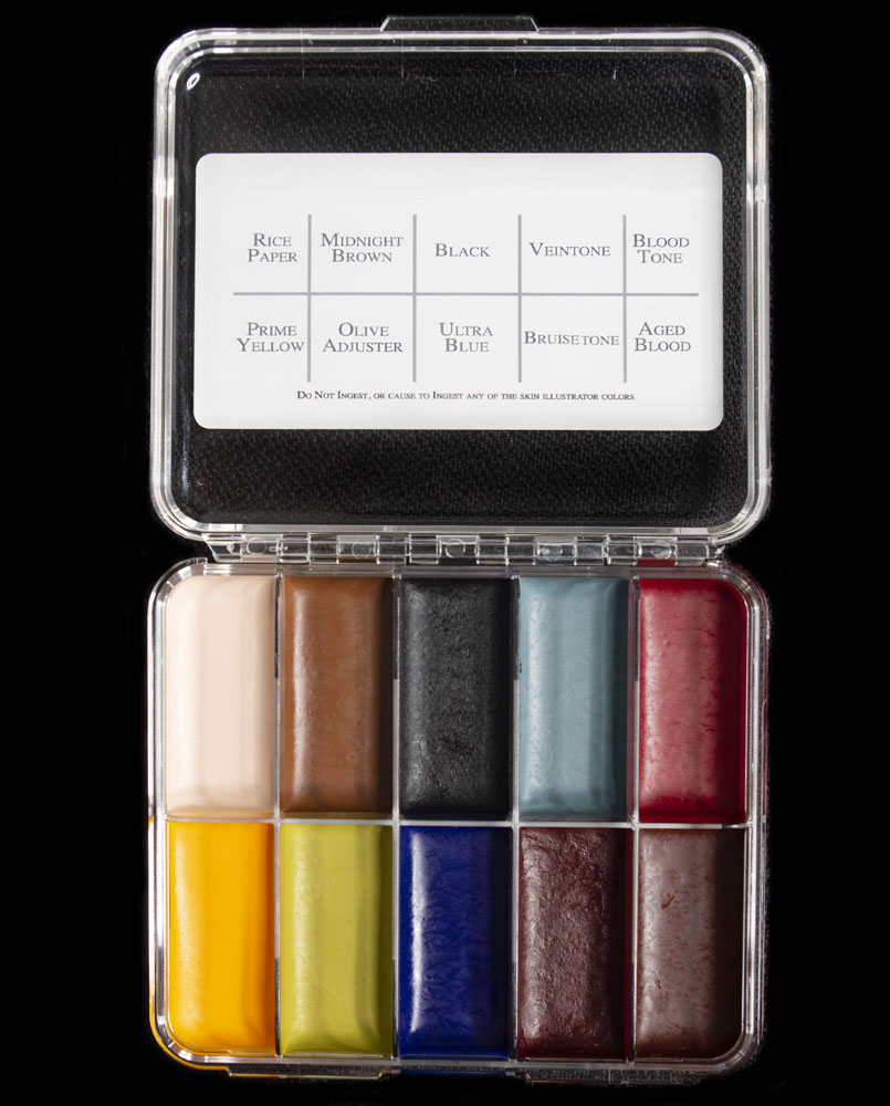 The Skin Illustrator Palettes are durable, water and abrasion resistant alcohol activated make-up. Created by professionals for professionals, Skin Illustrator is designed to speed up the process of color application and touch ups by greatly reducing the need to mix colors. The wide range of colors allow you total control to create any illusion imaginable. Skin Illustrator will cover tattoos, create effects, color hair, and it can be used on skin, foam latex, gelatin, plastic and silicone appliances The high pigment content provides rich color tones that stay in place and last all day.