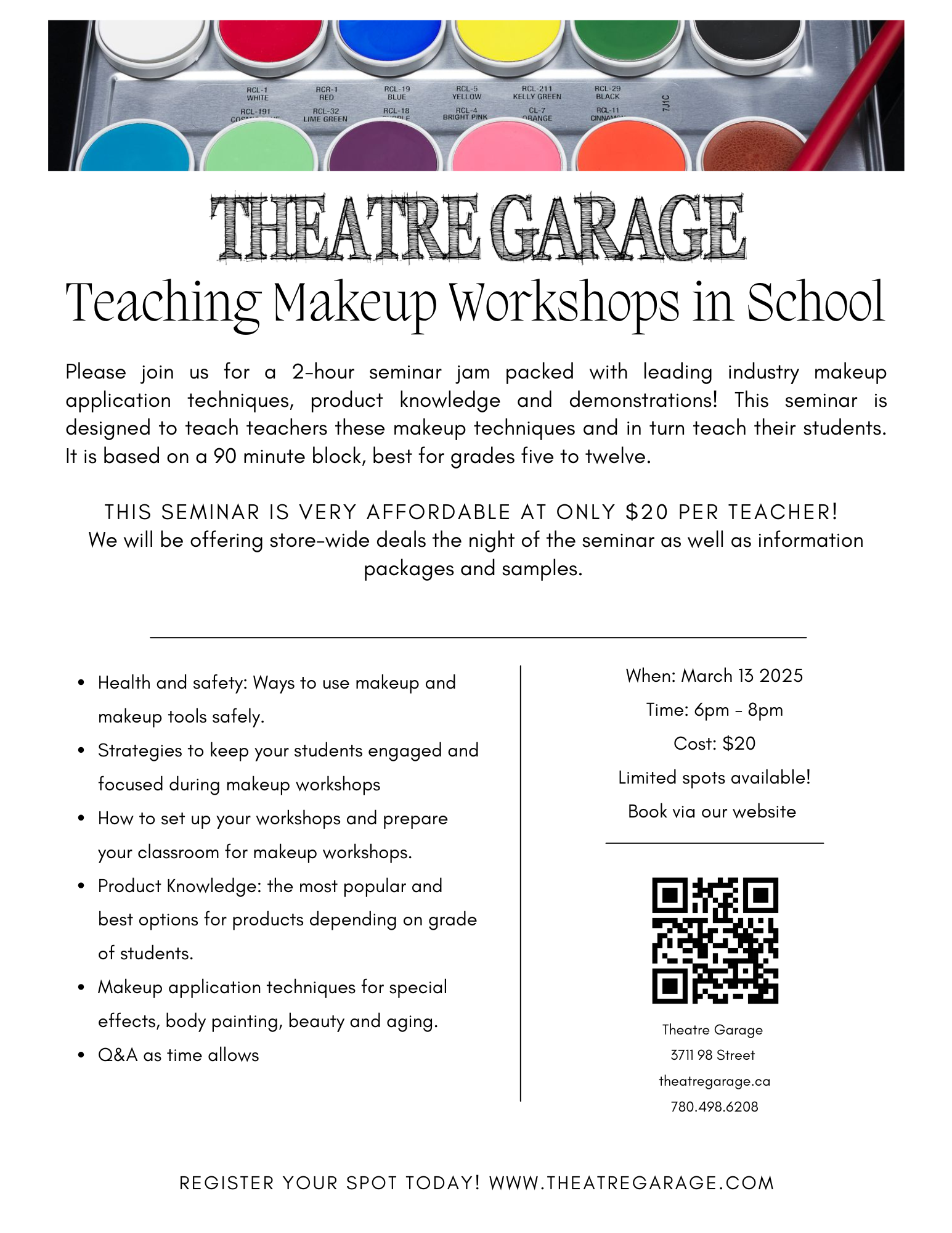 NEW DATE April 11 You have asked, we have listened! We at Theatre Garage have spent years sharing our knowledge and experience from the professional theatre industry with school teachers and their students. We have taught in-school, trained at our shop and instructed teachers through different makeup uses over the phone or email. We have […]